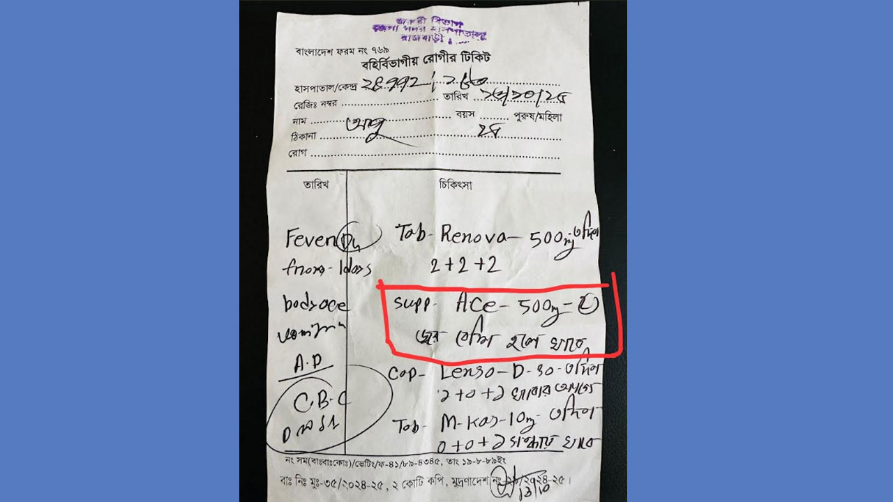 রাজবাড়ী সদর হাসপাতালের জরুরি বিভাগের এক প্রেসক্রিপশনে সাপোজিটরি খাওয়ার নির্দেশনা দেওয়ায় সামাজিক যোগাযোগ মাধ্যম ফেসবুকে ঘটনাটি ভাইরাল হয়েছে। বুধবার (১৫ অক্টোবর) ওই প্রেসক্রিপশনটির ছবি দিয়ে এক ব্যক্তির সামাজিক যোগাযোগ মাধ্যমে