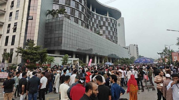 শুল্ক না কমিয়ে ন্যাশনাল ইকুইপমেন্ট আইডেনটিটি রেজিস্টার (এনইআইআর) কার্যক্রম চালুর প্রতিবাদে বিটিআরসি ভবন ভাঙচুর করছে বিক্ষোভকারীরা। হঠাৎ এমন আক্রমণে আতঙ্কিত হয়ে পড়েছেন বিটিআরসির কর্মকর্তারা। বৃহস্পতিবার (১ জানুয়ারি) বিকালে বিটিআরসি ভবনের
