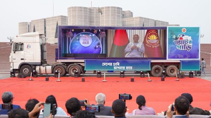 ত্রয়োদশ সংসদ নির্বাচন ও জুলাই জাতীয় সনদের বিষয়ে গণভোটের বিষয়ে সারাদেশে প্রচারণার লক্ষ্যে যাত্রা শুরু করেছে দশটি ভোটের গাড়ি— সুপার ক্যারাভান। সোমবার (২২ ডিসেম্বর) জাতীয় সংসদ ভবনের দক্ষিণ প্লাজায় আনুষ্ঠানিক