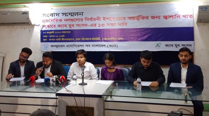 আসন্ন জাতীয় সংসদ নির্বাচনে রাজনৈতিক দলগুলোর নির্বাচনি ইশতেহারে অন্তর্ভুক্তির জন্য জ্বালানি খাত সংস্কারে ১৩ দফা দাবি জানিয়েছে কনজ্যুমারস অ্যাসোসিয়েশন অব বাংলাদেশের (ক্যাব) অঙ্গসংগঠন ‘ক্যাব যুব সংসদ’। মঙ্গলবার (১৩ জানুয়ারি) সকালে