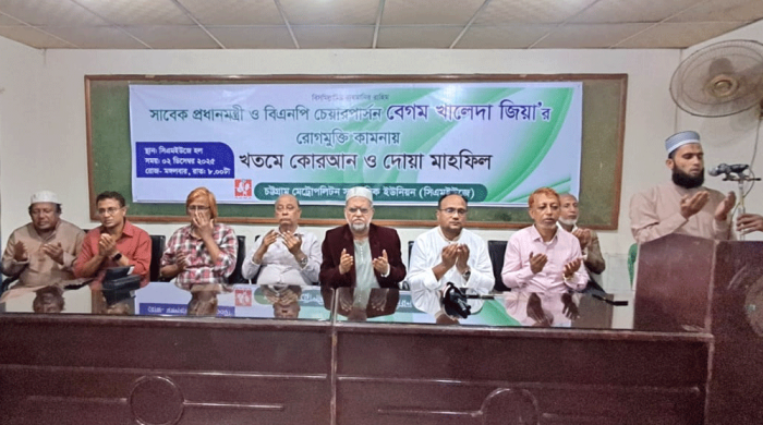 বিএনপি চেয়ারপারসন ও সাবেক প্রধানমন্ত্রী বেগম খালেদা জিয়ার সুস্থতা কামনায় চট্টগ্রাম মেট্রোপলিটন সাংবাদিক ইউনিয়নের (সিএমইউজে) উদ্যোগে খতমে কোরআন ও দোয়া মাহফিল অনুষ্ঠিত হয়েছে। মঙ্গলবার (২ ডিসেম্বর) রাতে সিএমইউজের মিলনায়তনে সংগঠনের
